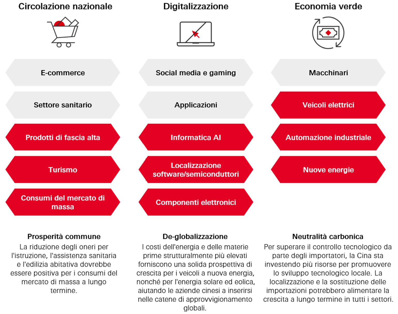Il chiaro orientamento delle politiche della Cina a favore della crescita e del mercato contribuirebbe ad attenuare i rischi esterni e a sostenere le prospettive cicliche del Paese. Le attuali misure di stimolo all’economia sottolineano l'impegno politico a difendere e raggiungere l'obiettivo di crescita e infondere stabilità e fiducia negli asset cinesi. La de-escalation dei dazi tra gli Stati Uniti e la Cina offre una tregua temporanea, che ha attenuato i rischi al ribasso per l'economia cinese e ridotto l'urgenza di ulteriori stimoli imminenti, con un effetto positivo per le azioni cinesi, sebbene i negoziati rimangano incerti e ci si possa aspettare il perdurare della volatilità del mercato globale.