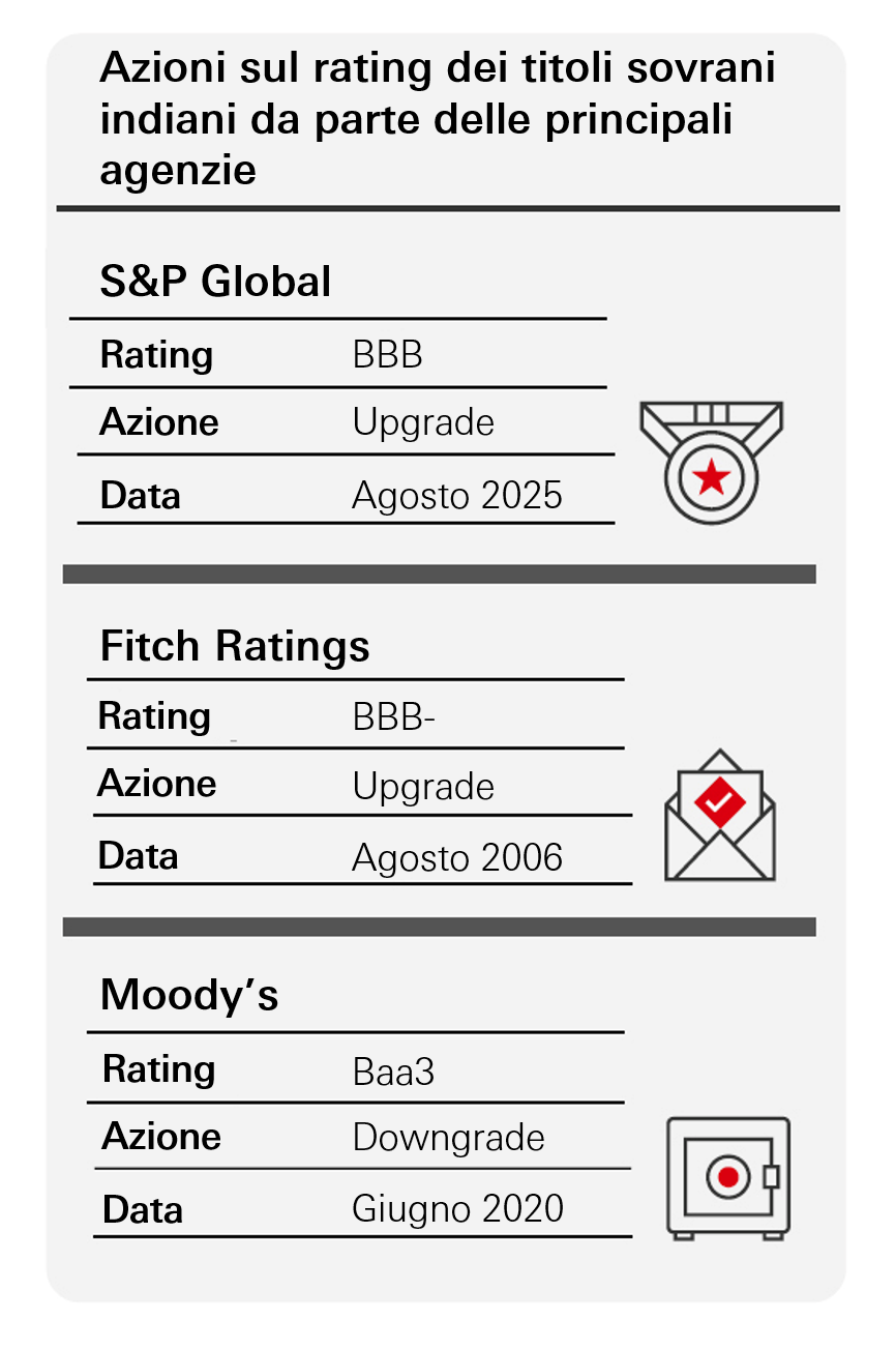Il rating del credito sovrano dell'India è stato recentemente innalzato da S&P Global, passando da BBB- a BBB. Il passaggio alla categoria investment grade superiore sblocca l’accesso a più ampi bacini di capitale a livello globale, riducendo il premio al rischio dell'India e abbassando i costi di finanziamento lungo le curve dei rendimenti sovrani e societari. Le obbligazioni indiane offrono già uno dei rendimenti investment grade più elevati e possono potenzialmente ottimizzare il rendimento di un portafoglio obbligazionario globale.