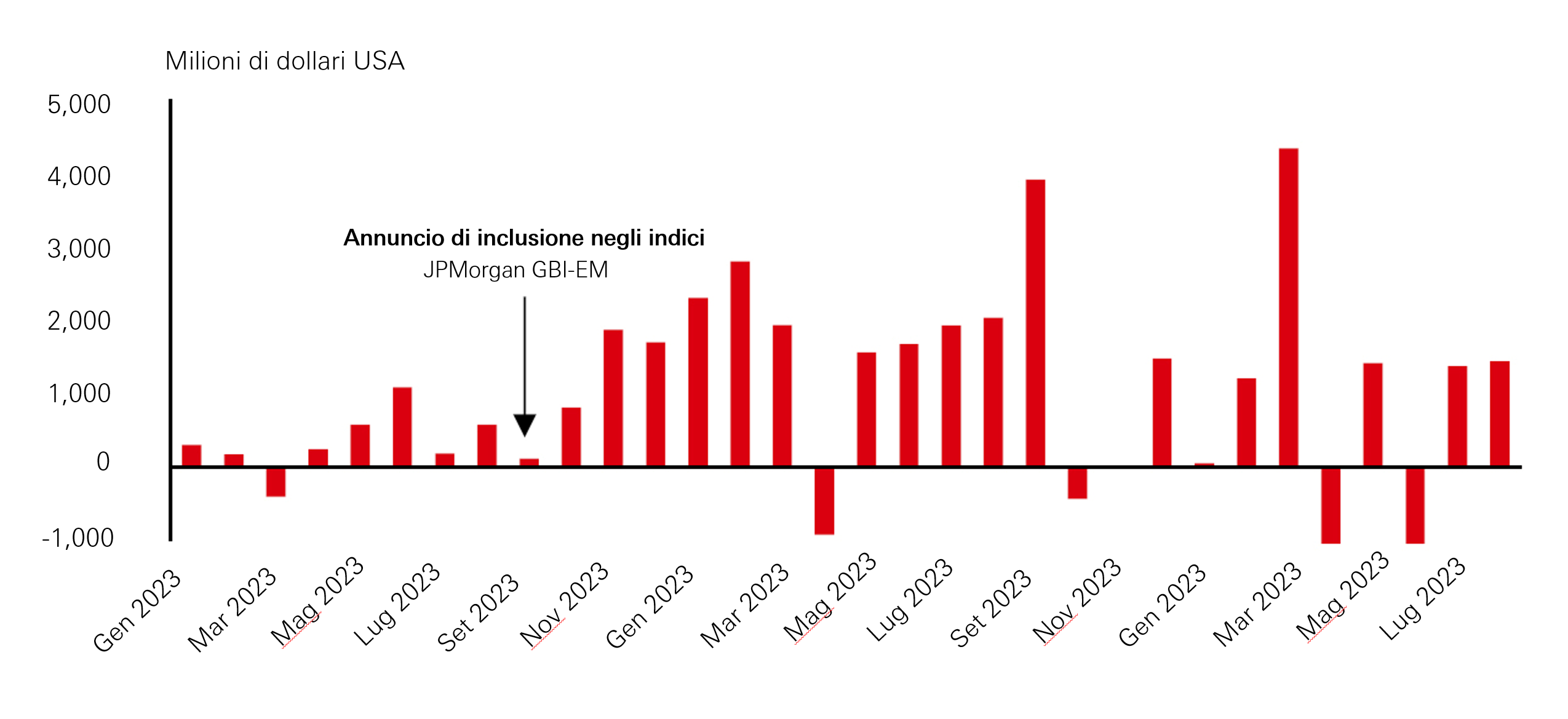 L'innalzamento del rating del credito sovrano indiano da parte di S&P rafforza la resilienza economica dell'India, la marcata crescita del PIL, il miglioramento della posizione fiscale con l'estero, l'efficienza delle riforme strutturali e la maggiore stabilità economica rispetto al passato. Al contempo, l'inflazione indiana si è moderata, trainata dal calo dei prezzi alimentari e dalla maggiore stabilità dell’inflazione core. Nell'insieme, ciò crea un contesto favorevole e costruttivo per le obbligazioni indiane. La revisione della tassa sui beni e i servizi (GST) in India, annunciata all'inizio di settembre, potrebbe far aumentare il deficit fiscale, ma riteniamo che si tratterà di un aumento limitato che potrebbe essere compensato dalla riscossione di imposte dirette potenzialmente più elevate.