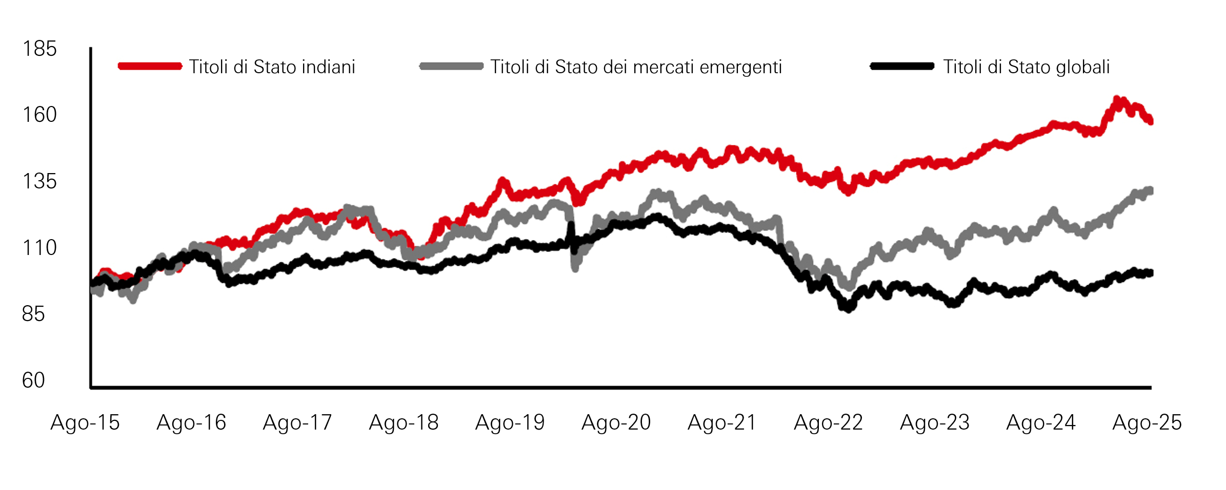 L'aggiunta di obbligazioni indiane a un portafoglio obbligazionario globale potrebbe potenzialmente offrire vantaggi in termini di diversificazione, oltre a migliorare i rendimenti. Negli ultimi 10 anni i titoli di Stato indiani hanno sovraperformato in modo significativo i titoli di Stato globali e dei mercati emergenti. Anche la correlazione tra le obbligazioni indiane e le obbligazioni globali è stata bassa, a solo 0,15, negli ultimi 10 anni,3 supportando la tesi a favore delle obbligazioni indiane come fattore di diversificazione, soprattutto nell’attuale contesto di incertezza globale.