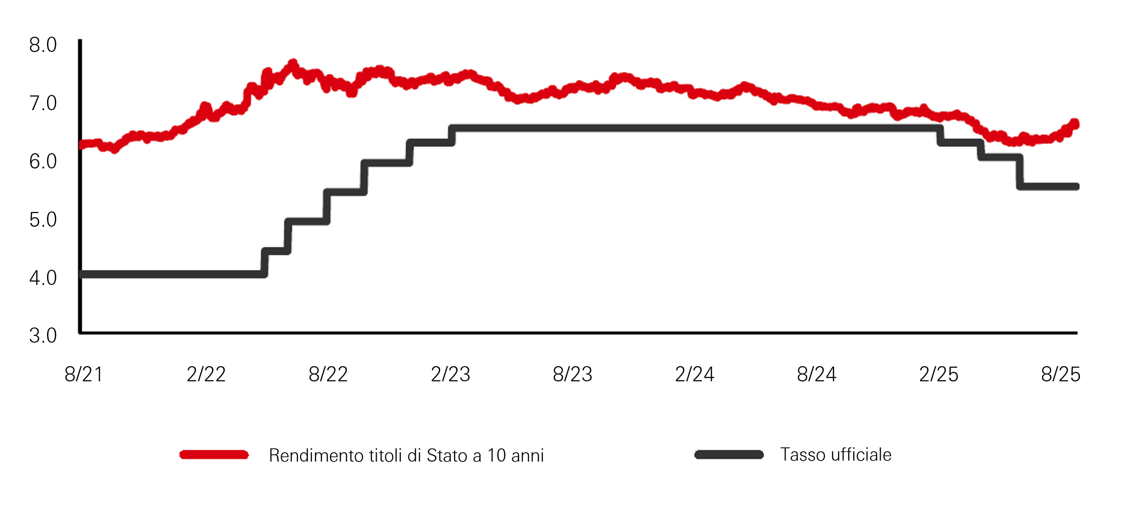 La Reserve Bank of India (RBI) ha mantenuto i tassi invariati nella riunione MPC di agosto, ma aveva anticipato i tagli nelle riunioni precedenti. Riteniamo che vi possa essere un margine di manovra per la seconda parte dell'anno, che dipenderà anche dalla valutazione delle incertezze relative ai dazi sulla crescita indiana.